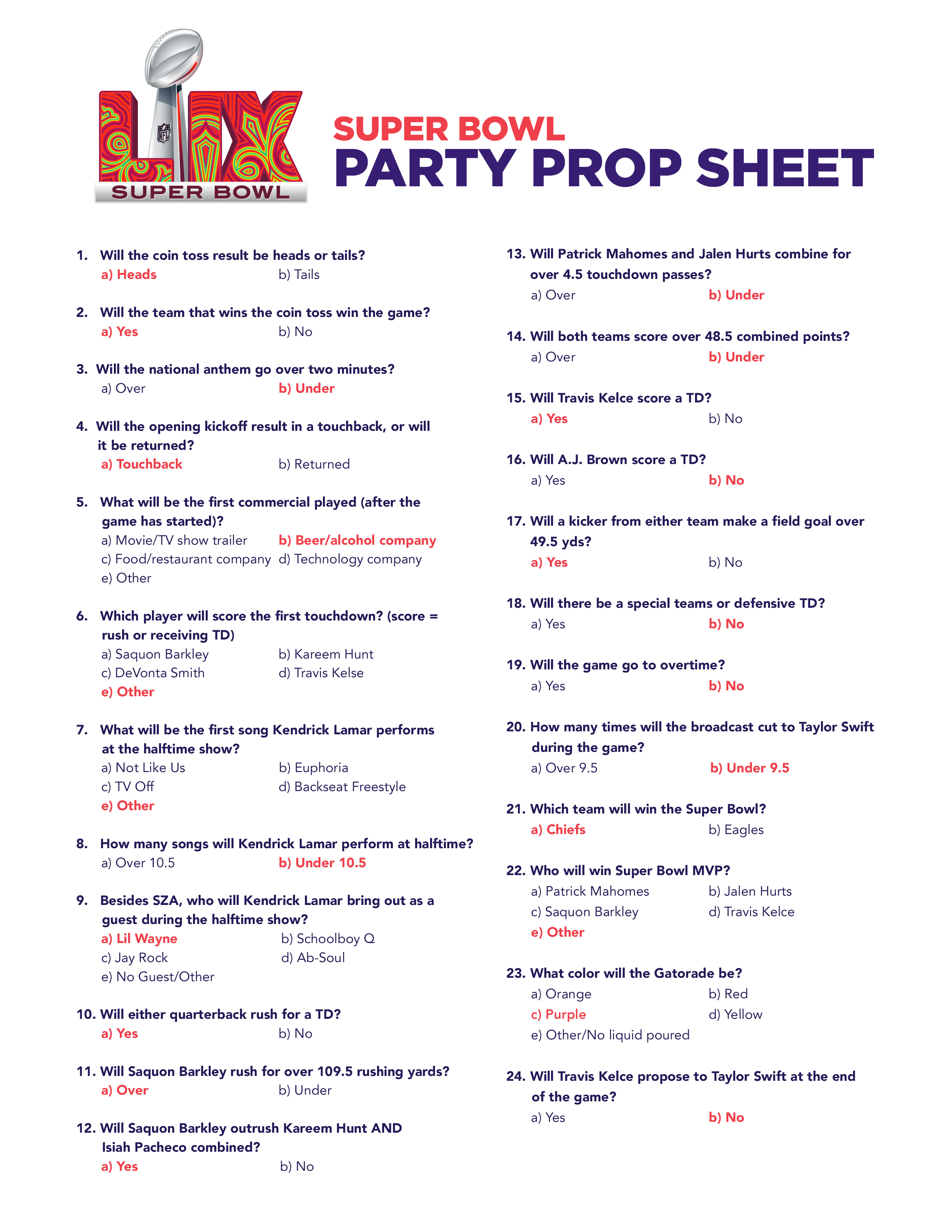 Have you ever been to a Super Bowl party where everyone chips in a few bucks and fills out a prop sheet? Well, this is exactly what we’re doing here!