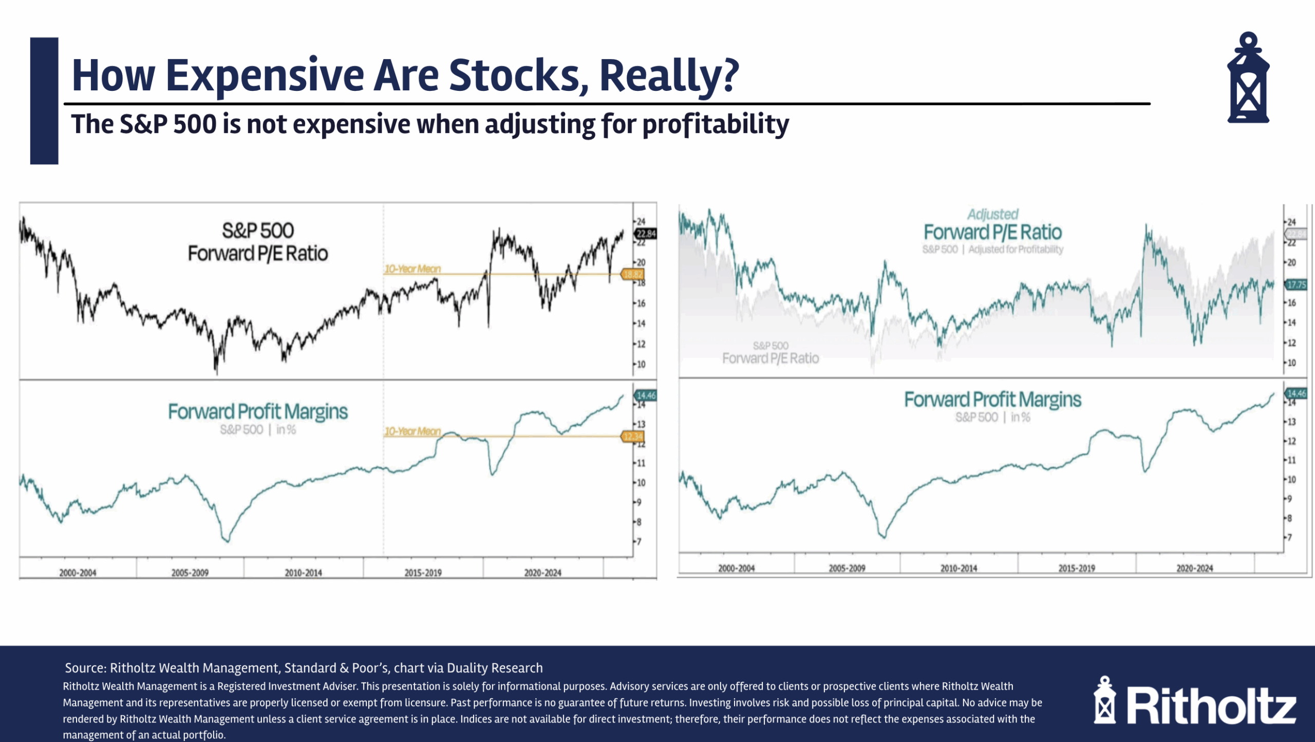 If you take this efficiency into account by adjusting valuations for the changes in margins, the market doesn’t appear as expensive as you might think: