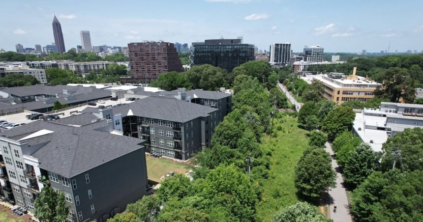 An aerial photo shows dense trees along the Beltline’s Southwest Trail on Thursday, March 12, 2026. (Hyosub Shin/AJC)