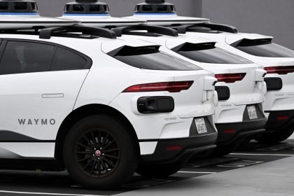 A Waymo autonomous self-driving Jaguar electric vehicle sits parked at an EVgo…