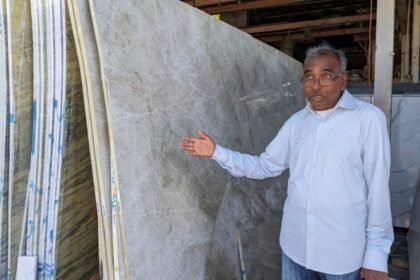 Sridhar Kollareddy walks between thousands of imported marbled granite slabs, slated to…