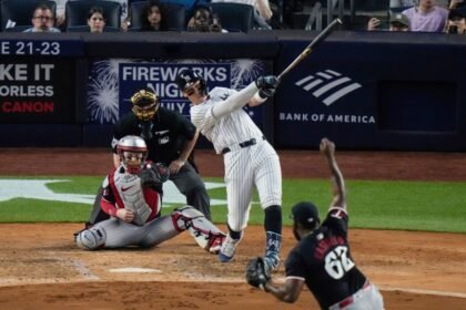 New York Yankees’ Aaron Judge follows through on a two-run triple against…
