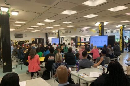 Adam Zuvanich/Houston Public MediaHouston ISD stakeholders gathered in the Fondren Middle School…
