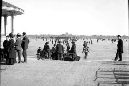 Ice skating on City Park Lake, Denver, Colorado; view east to Museum…
