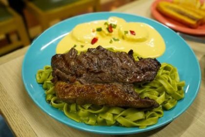Tallarines verdes, a Peruvian-style pesto pasta topped with steak, from El Latino…