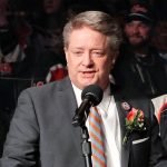 Former President Donald Trump talks with Georgia Gov. Brian Kemp after speaking at a temporary relief shelter in Evans, Ga., an area impacted by Hurricane Helene.