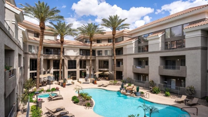 The multifamily gated complex is at 901 E. Van Buren St. It has two parking structures, two swimming pools, barbecue grills and seating, an outdoor lounge, indoor coworking spaces, a 24-hour fitness center and a dog park.