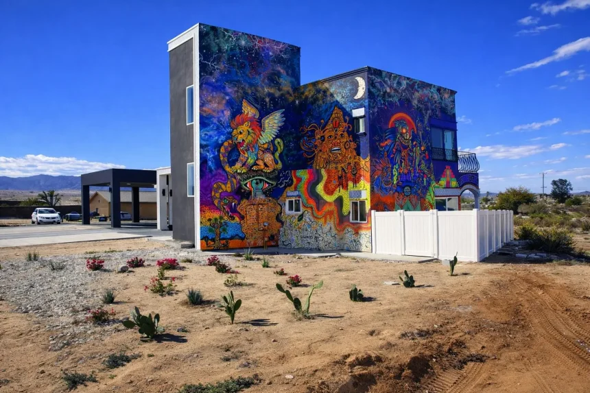 If you have recently driven along Sunburst Street in Joshua Tree, you have likely noticed a brightly painted, two-story house across the street from the old JT Elementary School. The recent build has received a spectrum of responses from the Hi-Desert community and Reporter Adeline J. Wells sat down with the property owner to learn more about the unique house and the story behind its design.