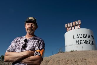 Neon casino signs beckon to weary travellers along the Colorado River at…