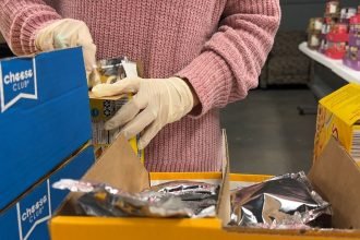 CLEVELAND — Pasta, canned foods and other ingredients fill a plastic bin outside…