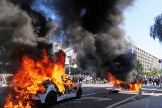 Two Waymo taxis burn near the metropolitan detention center of downtown Los…