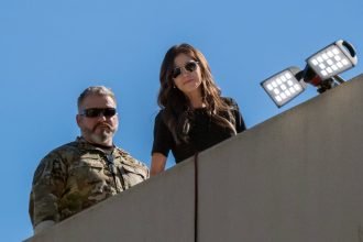 U.S. Department of Homeland Security Secretary Kristi Noem stands on the roof…