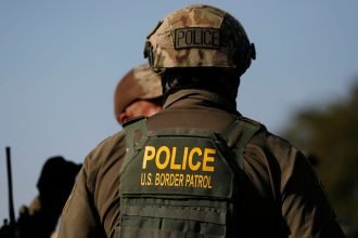 U.S. Customs and Border Protection agents stand guard near an Immigration and…
