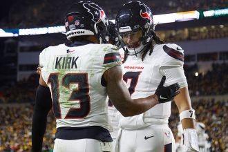 article FILE-Christian Kirk #13 of the Houston Texans and C.J. Stroud #7…