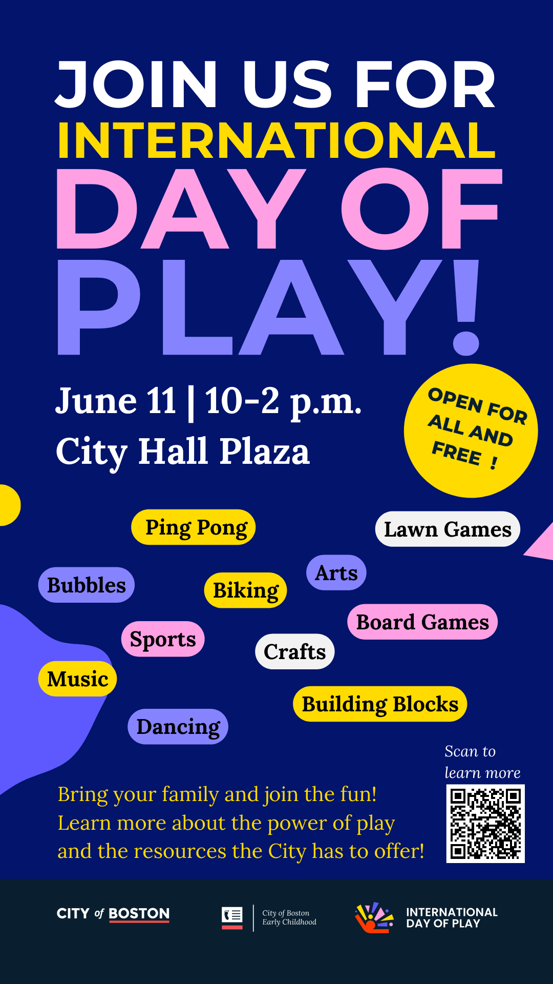 It’s time to add some fun into your schedule. The City of Boston is partaking in the first International Day of Play on Tuesday, June 11, 10 a.m.-2 p.m, at City Hall Plaza.