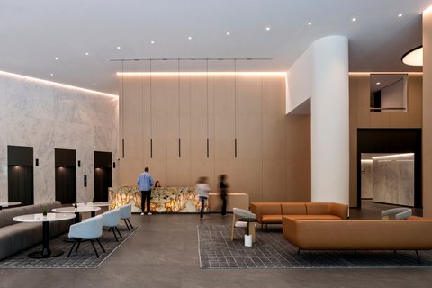 Expansive Sky Lobby now fosters a grand arrival and collaboration with a tenant lounge, barista stand, conference center, and indoor and outdoor seating.