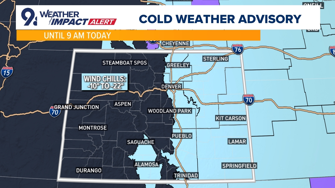 A Cold Weather Advisory was in place for Denver, the northern Front Range and Colorado’s eastern plains until 9 a.m. Monday for wind chills in the -10 to -22 degree range.