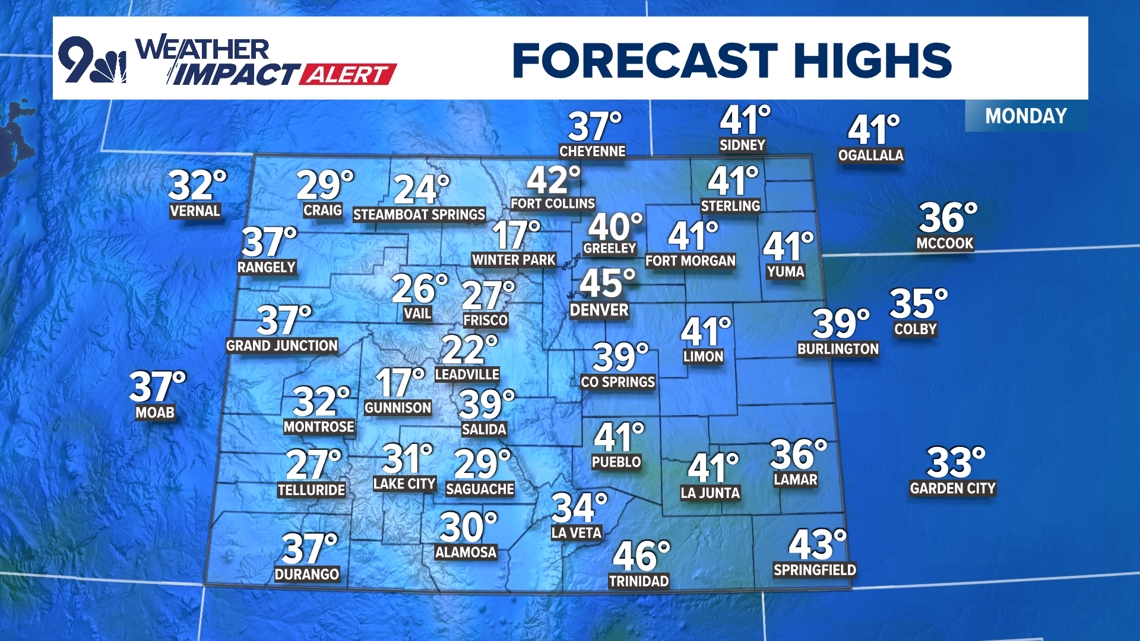 After three days of below-freezing temperatures and a fresh round of snow on Sunday, skies will clear out on Monday for a warm-up in Colorado. The sunshine and milder temperatures this afternoon should lead to melting in the Denver area with highs in the 40s on Monday.