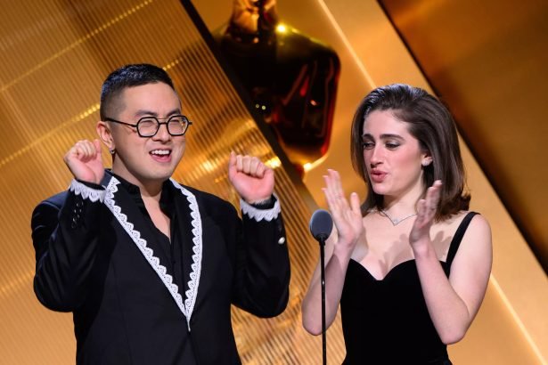 Aurora's Bowen Yang (left) with actress Rachel Sennott. Richard Harbaugh/The Academy While…