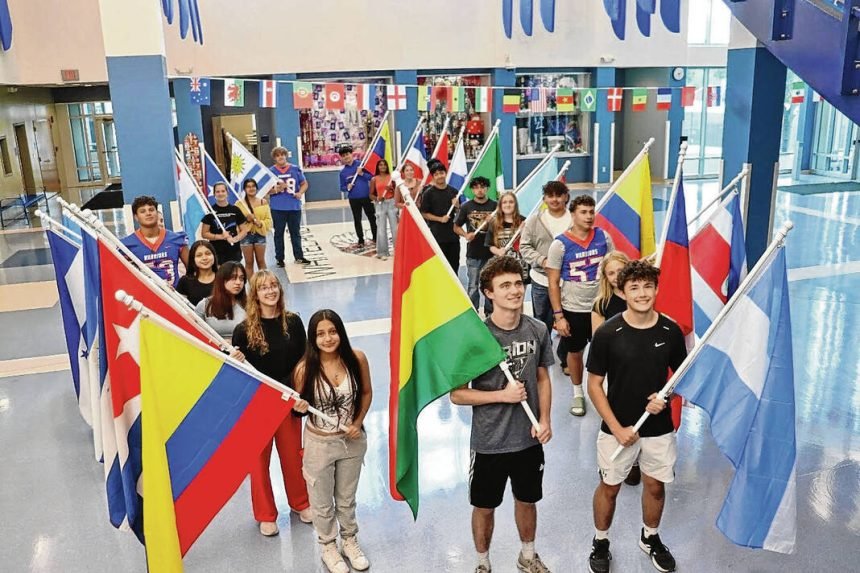 Members of the Spanish Honor Society at Whiteland Community High School prepare for a flag parade through the hallways of the school in celebration of Hispanic Heritage Month in 2024. The honor society is partnering with the Clark Pleasant branch of the Johnson County Public Library to host Hispanic Heritage Month Community Day on Oct. 4.