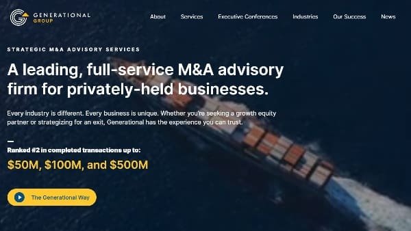 Generational Group, headquartered in Dallas, TX, is a leading, award winning full-service M&A advisory firm. Generational has over 300 professionals across 16 offices in North America. The firm empowers business owners to unlock the full value of their companies through a comprehensive suite of services—including strategic growth consulting, exit planning education, business valuation, value enhancement strategies, M&A advisory, digital solutions, and wealth management.