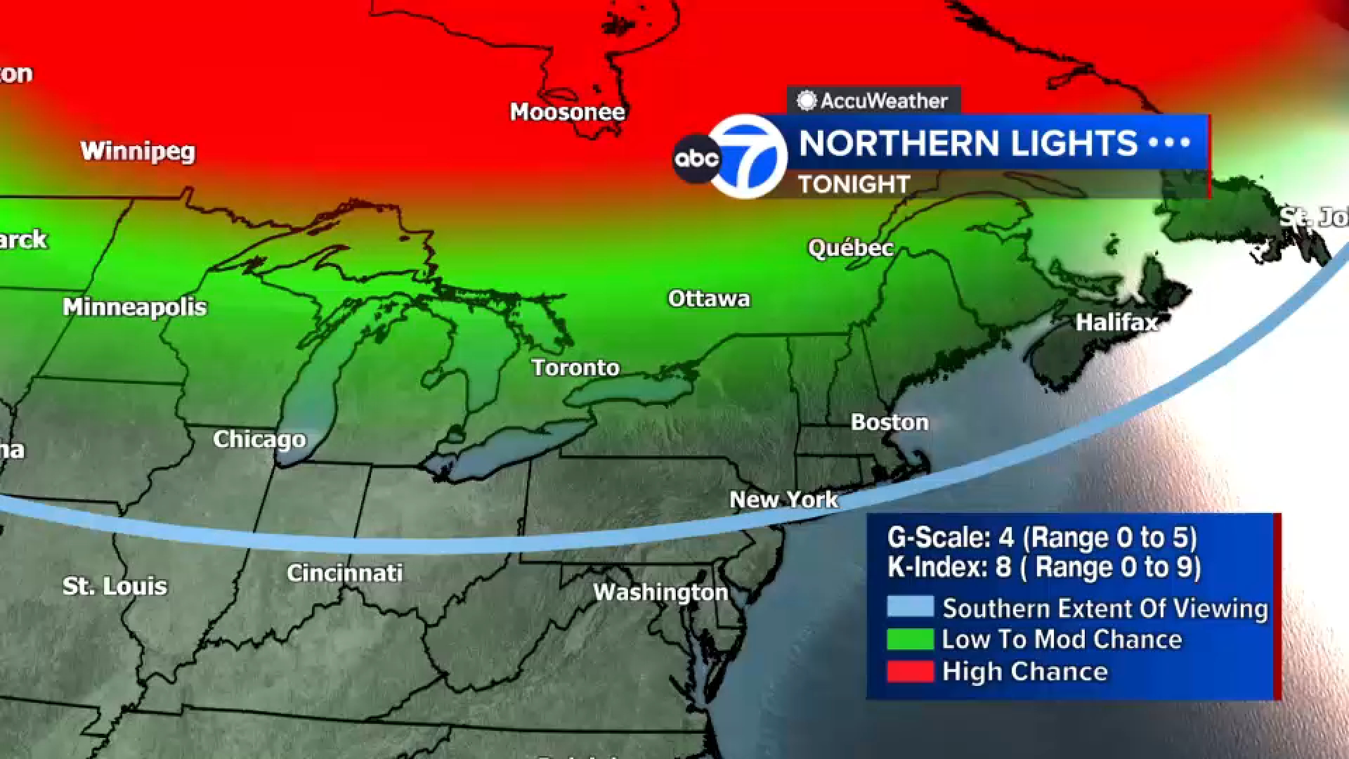 NEW YORK — A strong geomagnetic storm could interact with Earth’s atmosphere Monday evening into Tuesday morning, bringing the potential for northern lights displays to New York City and the Tri-State area, according to space weather experts.