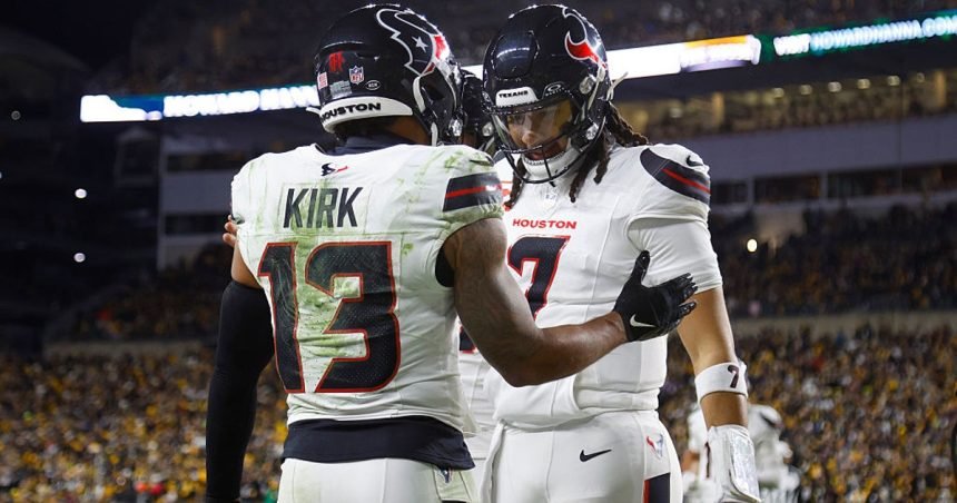 FILE-Christian Kirk #13 of the Houston Texans and C.J. Stroud #7 of the Houston Texans celebrate after a touchdown in the second quarter of an NFL wild card playoff game against the Pittsburgh Steelers at Acrisure Stadium on January 12, 2026 in Pitts