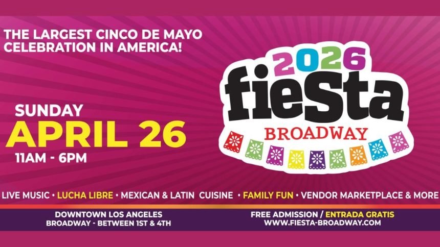 The Fiesta Broadway 2026 celebration will transform Broadway in Downtown Los Angeles into a vibrant street fair filled with performances, vendors, and cultural showcases. Admission to the festival is free and open to all.