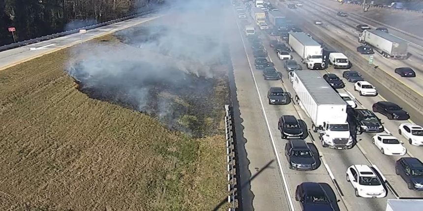 Footage from the scene showed heavy smoke billowing into the air and grass in the median burning.
