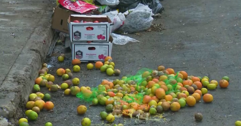 The aftermath looks less like a city sidewalk and more like a produce market gone wrong. For weeks, sanitation crews say they’ve been cleaning up tons of fruits and vegetables dumped onto the street.
