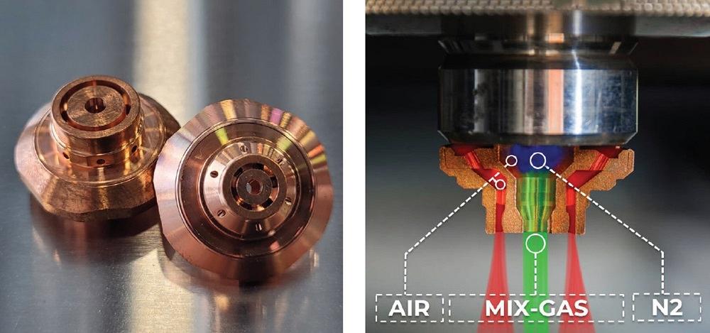 He was referring to AGR-MIX, which uses low-pressure compressed air, some of which flows out of a nozzle in a shroud surrounding the core column of assist gas. Here, though, a portion of the air gets funneled into a mixing chamber in the nozzle. There, the air combines with pure nitrogen to create a mix of, say, 95% nitrogen and 5% oxygen (or other percentages).