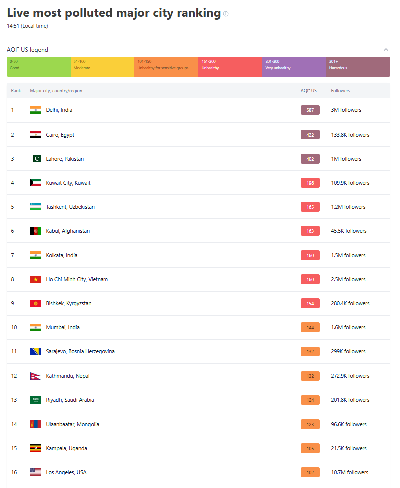 Air quality is dynamic and, like the weather, can change frequently. Los Angeles ranks 16th among the most polluted cities in the world on Saturday morning.