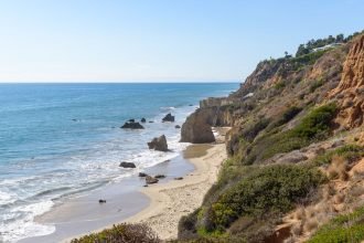 This crescent-shaped beach in Malibu runs about one mile long and is…