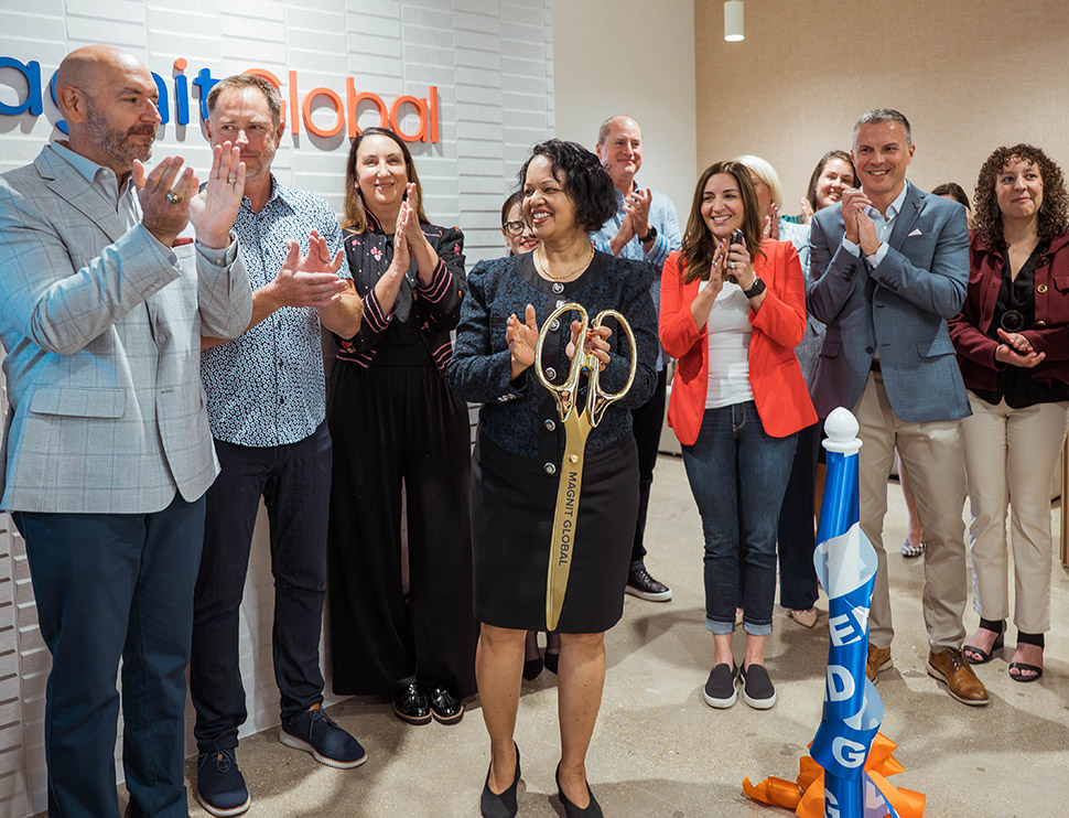 Magnit CEO Chandra Dhandapani (fifth from left) joins company leaders at the ribbon-cutting for the firm’s new executive headquarters in Addison. From left: Alex Kevork, chief marketing officer; Jim Bradley, chief operating officer; Penny Queller, president, commercial global accounts; Rudy Gonzalez, chief financial officer; Dhandapani; Alan Gilchrest, chief digital and technology officer; and Maria Luoni, president, healthcare and commercial, Americas. [Photo: Magnit Global]