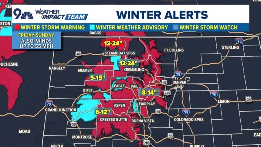 The National Weather Service has issued Winter Storm Warnings for most of Colorado’s central and northern mountains, where as much as two feet of snow could fall this weekend.
