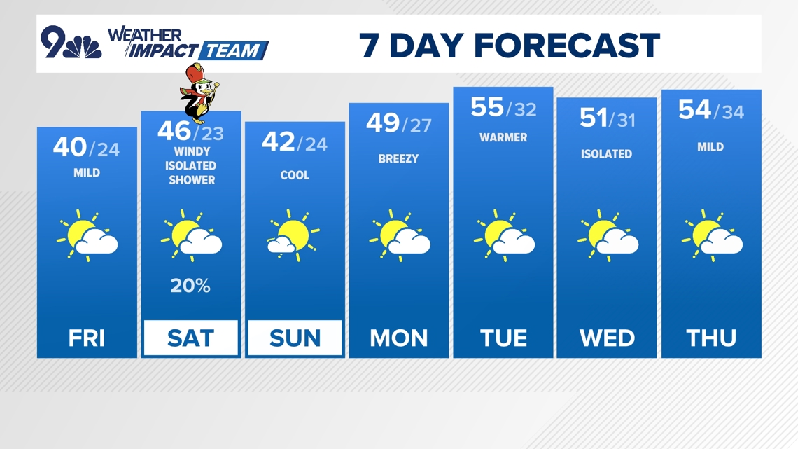 - FRIDAY: Partly cloudy and mild. High 40, low 24.