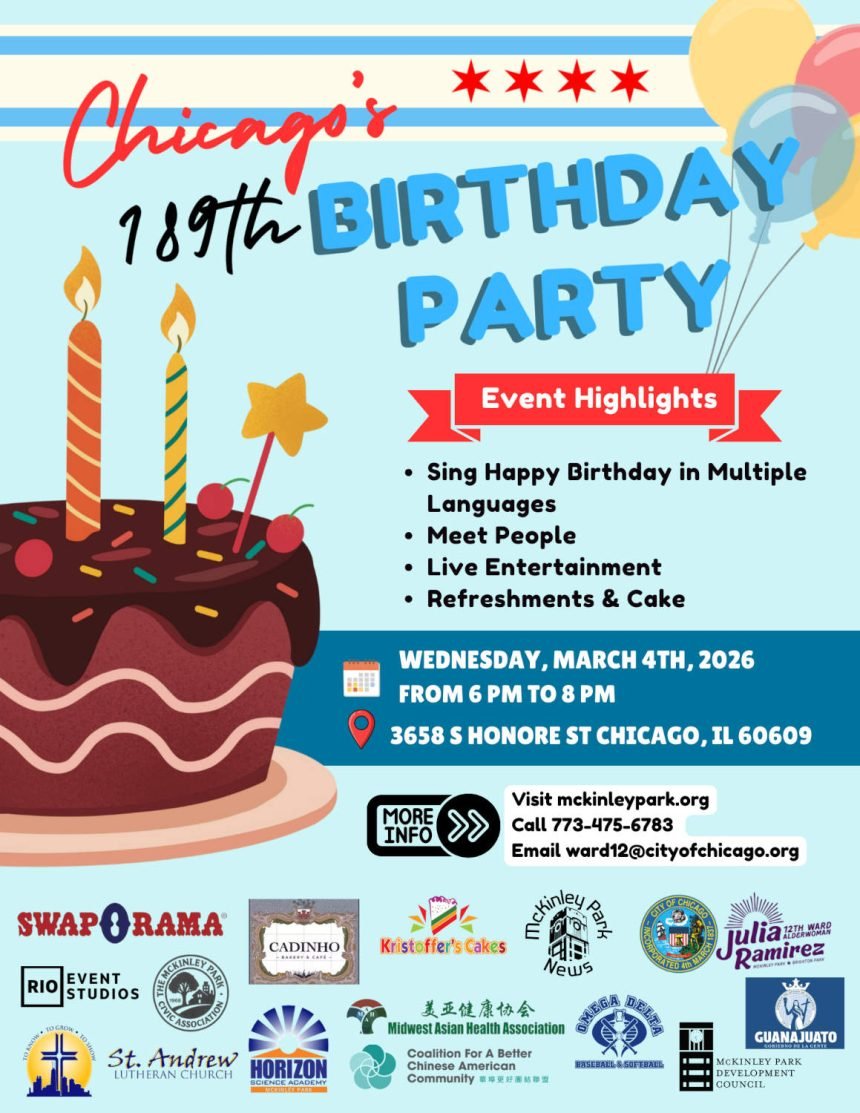 The McKinley Park News is very proud to be the founding organization and ongoing supporter for Chicago’s Birthday Party, which brings together celebrants at the city’s geographic center to sing Happy Birthday to Chicago in multiple languages on the anniversary of the Chicago’s founding on March 4, 1837.