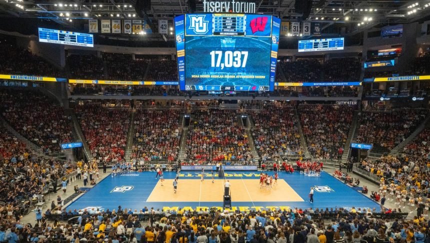 The attendance total eclipsed the NCAA mark for a regular-season indoor match of 17,037 set by MU and UW at Fiserv Forum in 2023.