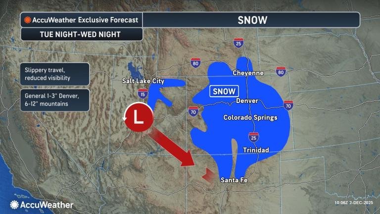 Snow is likely to extend farther south into southern Colorado and northern New Mexico. At least a couple of inches is forecast to fall on Colorado Springs. Several inches of snow are likely to blanket the Colorado Rockies and the mountains of northern New Mexico by the middle of the week.