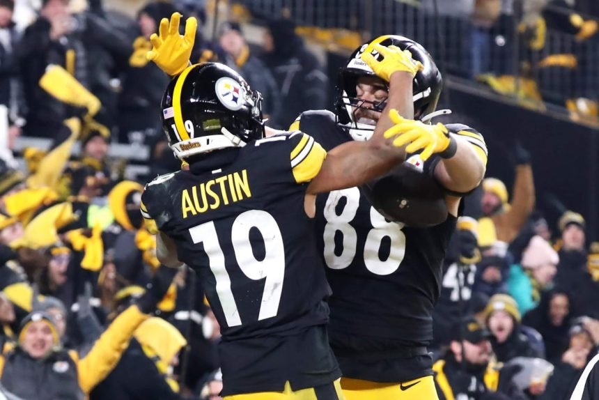 Calvin Austin caught the game-winning 26-yard touchdown pass as the Steelers clinched the AFC’s last playoff spot with a 26-24 win over the Ravens on Sunday night. Charles LeClaire / Imagn Images