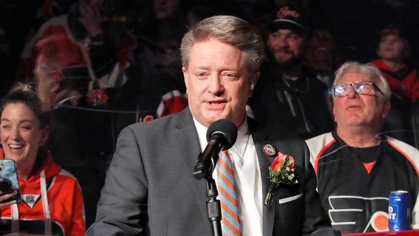 Tim Saunders hosts a pregame ceremony honoring Steve Coates, a 43-year career as a member of the broadcast team for the Philadelphia Flyers, at the Wells Fargo Center in Philadelphia, Pennsylvania, on April 1, 2023. (Len Redkoles/NHLI via Getty Images)