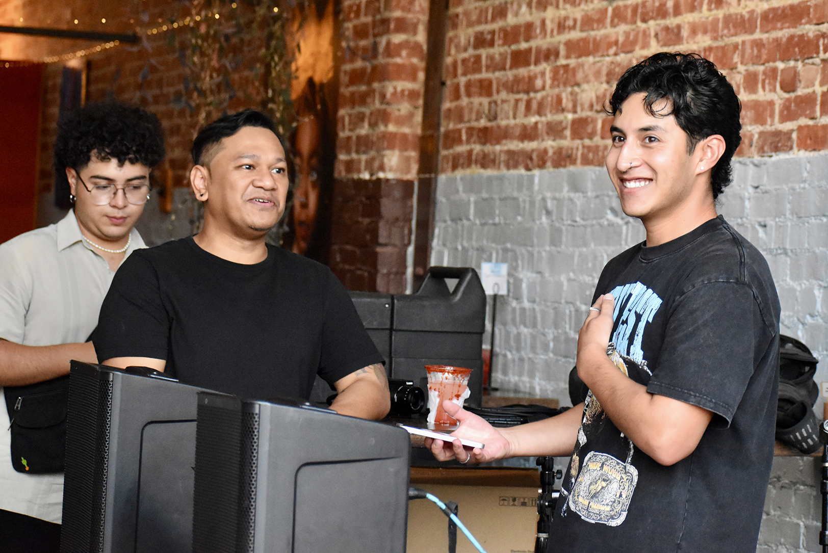 Danny Soriano shares a laugh with event-goers during his DJ set at Café Corazón during “A Night Without Borders”; photo by Nikki Overfelt Chifalu, Startland News