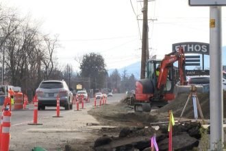 Maintenance crews work on new side walks near the south side of…
