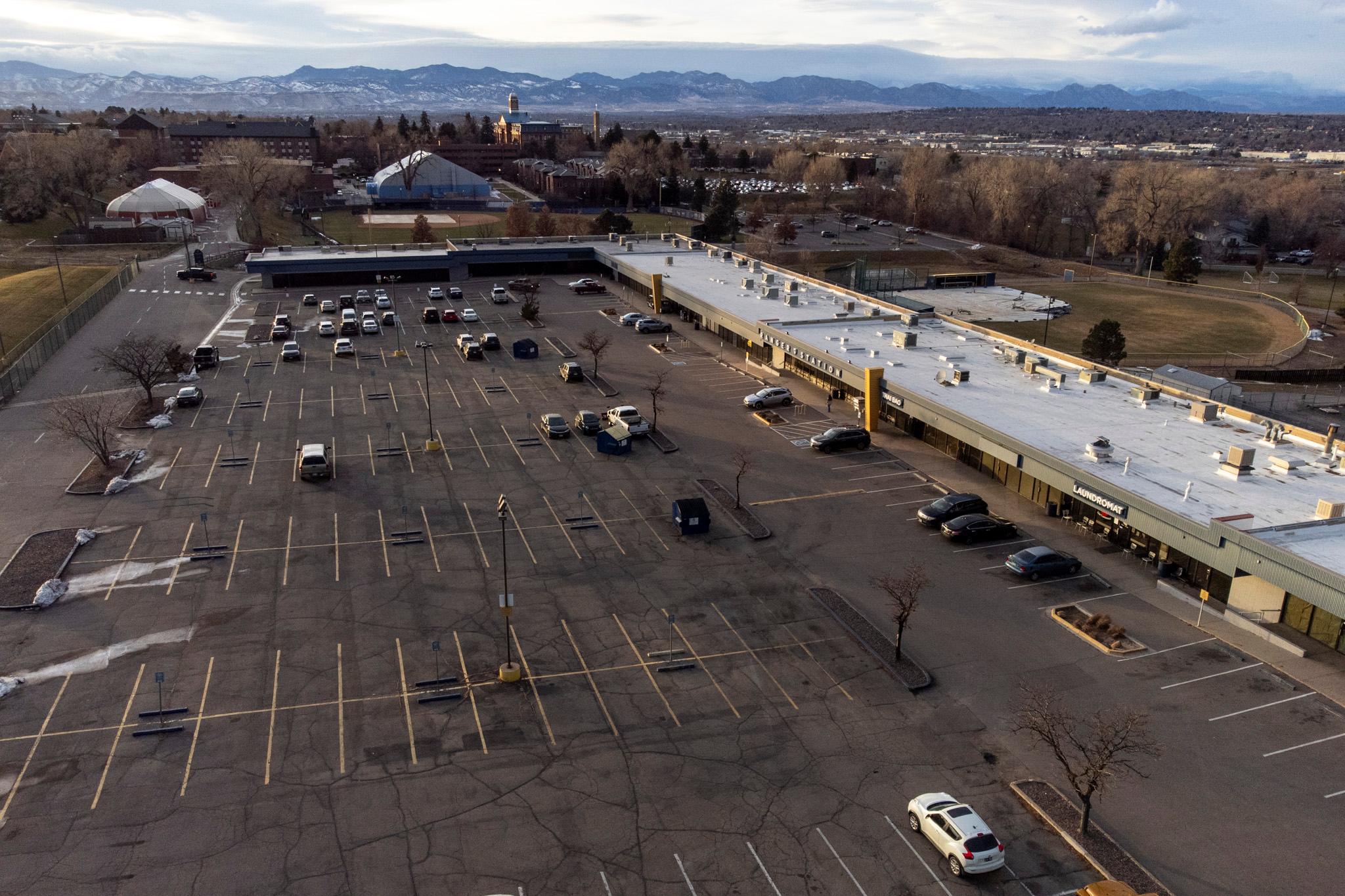 A strip mall on Federal Boulevard owned by Regis University, on the edge of its north Denver campus. Dec. 9, 2025.