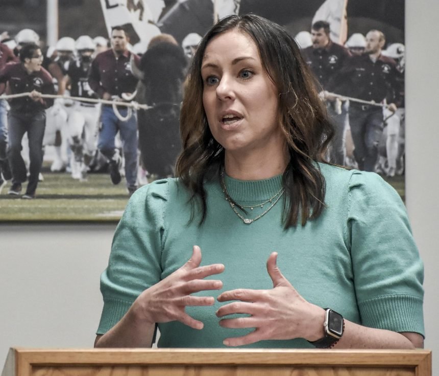 Jessica Nothern, USD 457 Chief Financial Officer, speaks on bond refinancing at the USD 457 Board of Education meeting on Monday night. MEGHAN FLYNN/GARDEN CITY TELEGRAM