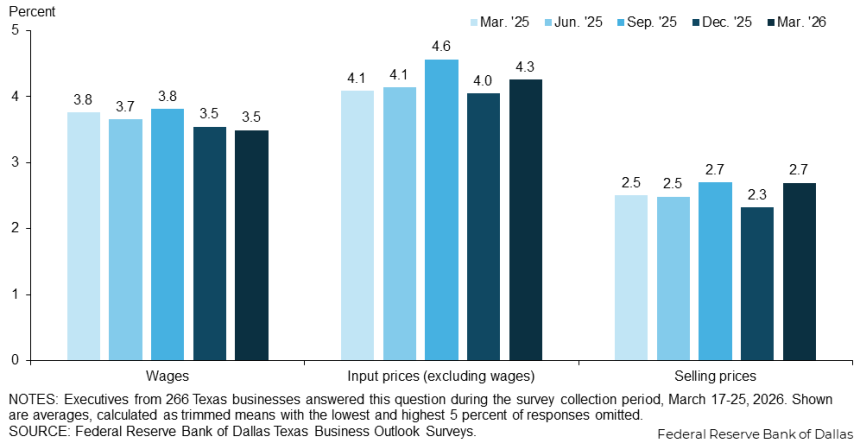 Wage growth held steady while price growth accelerated. Texas firms surveyed report wage growth of 3.5 percent over the past 12 months, on average, 4.3 percent growth in input prices and 2.7 percent growth in selling prices. The recent pickup in price growth is largely driven by the manufacturing sector.