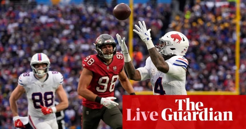We are back! Buffalo take over on their 45-yard line. A penalty and a short pass blown up behind the line puts the Bills on 3rd and 16 … Allen takes the snap hangs out in the pocket for an age then scampers upfield. He pauses and tries to throw a lateral but the ball is just going forward a touch. So close. His momentum just took the ball a few inches ahead of where he wanted it. Punt.