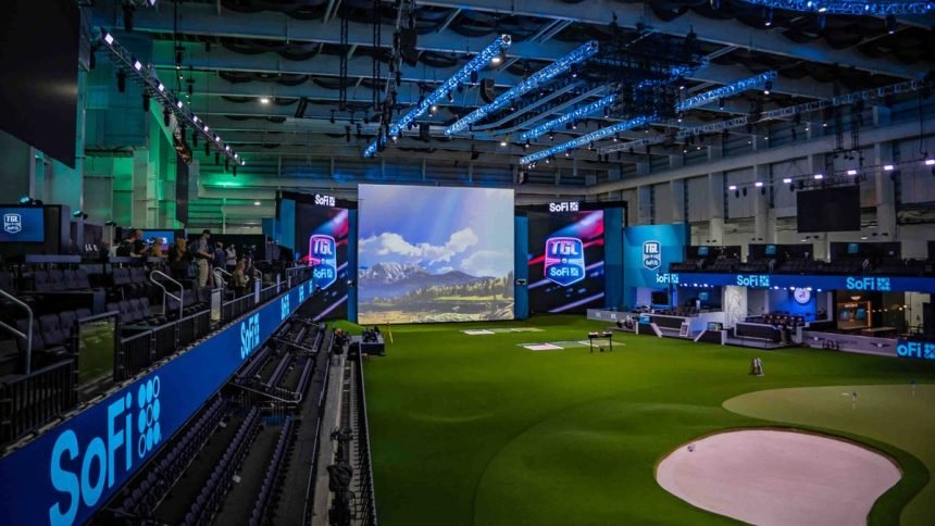 All TGL matches are played at SoFi Center, a 250,000-square-foot venue on the campus of Palm Beach State College in Palm Beach Gardens, Florida. There is a real grass teeing area, which players to hit into a large virtual screen. From there, putting and chipping take place on a large chipping and putting area.