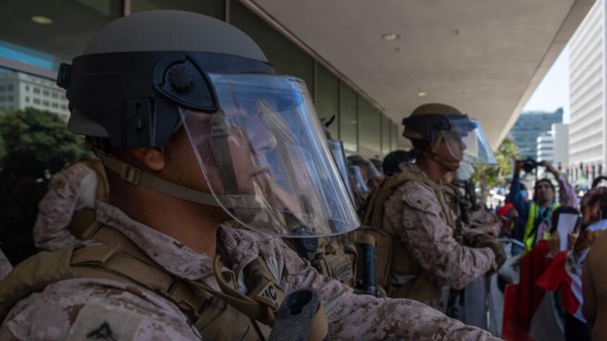 In their six weeks in the Los Angeles area, the Marines have largely avoided both police actions and publicity. In the operation’s early days, Marines briefly detained an Army veteran after he briefly entered the grounds of the Wilshire federal building on his way to an appointment on the nearby Veteran Affairs campus.