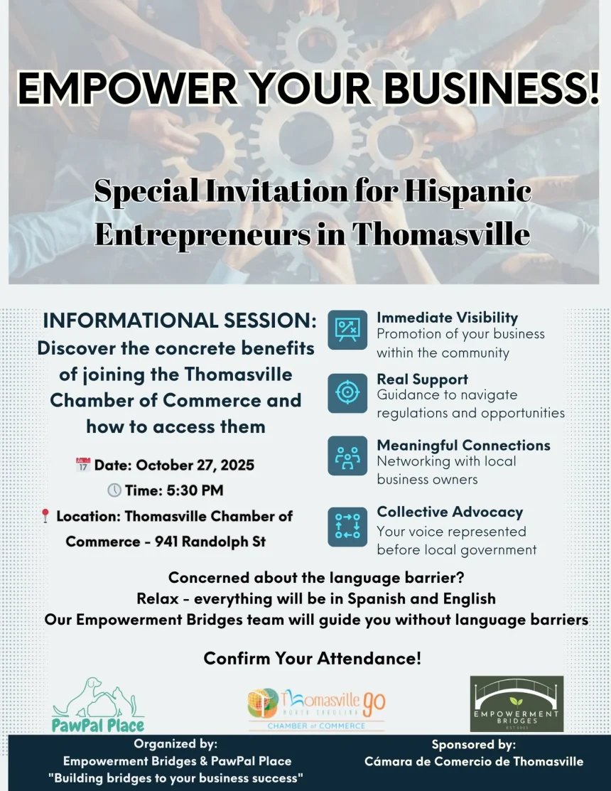 The event is being organized by Empowerment Bridges & PawPal Place and is a direct outreach effort to ensure Thomasville’s Hispanic business owners can access available support. The meeting’s timing is intentionally set during Hispanic Heritage Month.